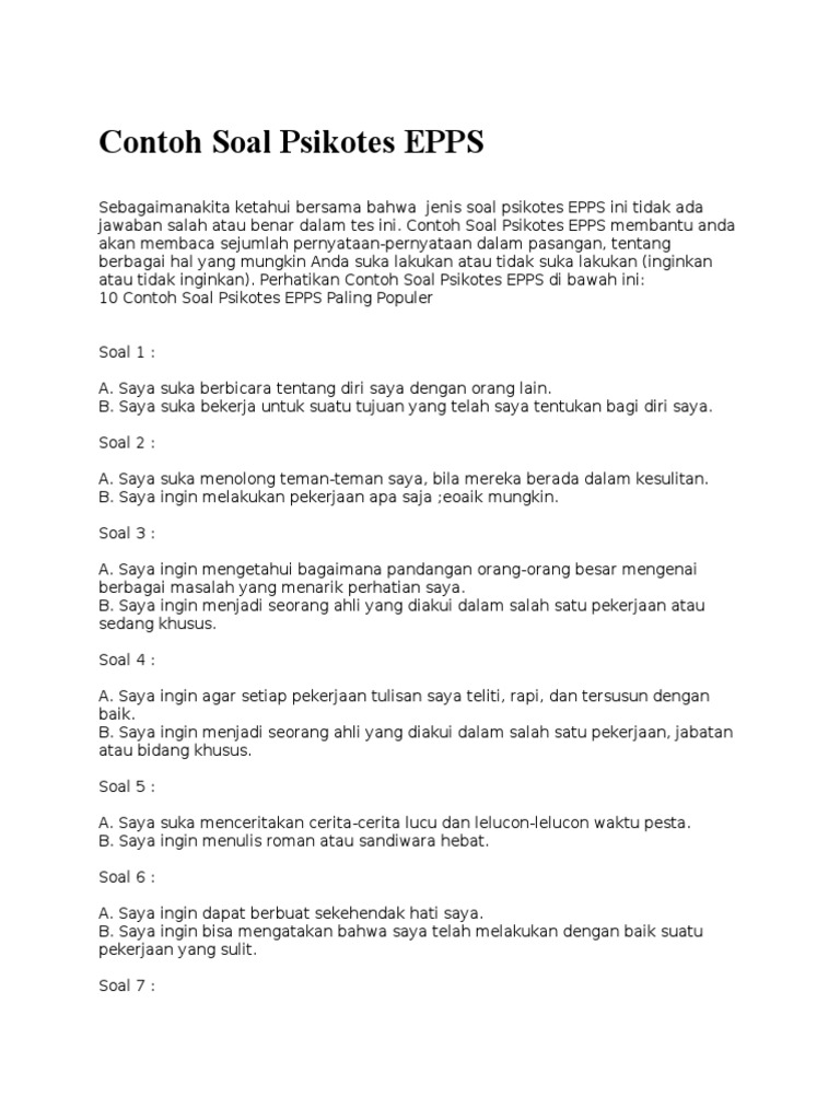 Contoh soal psikotes epps pdf. Soal soal psikotes kerja pdf paket psikotes tes psikologi wawancara lihat disini. Epps mengukur lima belas variabel kepribadian. Dibawah ini adalah gambar lembar jawaban untuk soal psikotes epps.